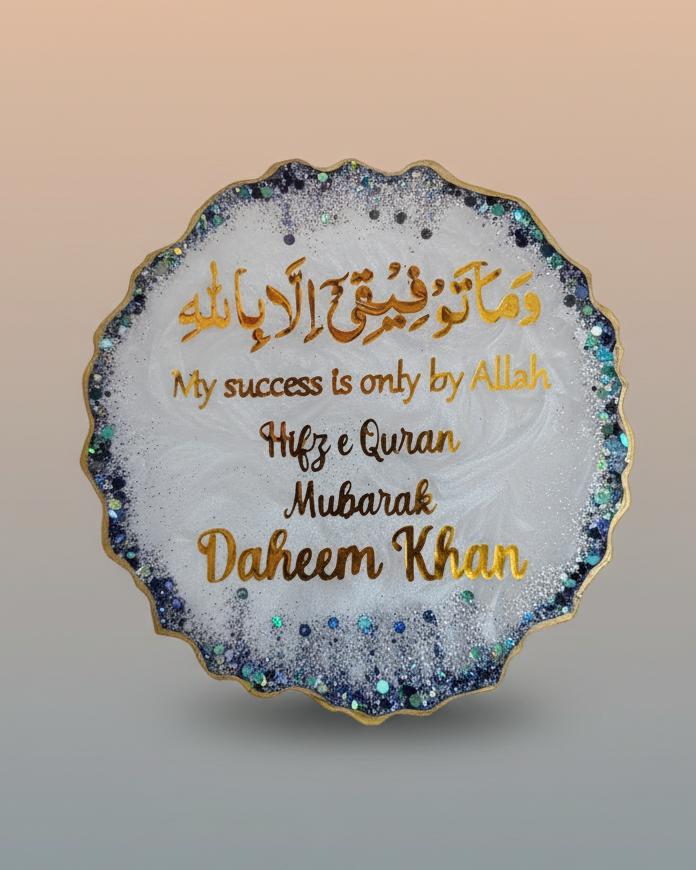 This handcrafted Lunis Resin Art plaque features elegant Quranic verses, shimmering borders, and your personalized name in gold, making it the perfect gift for milestones like Hifz-e-Quran and other religious celebrations. The artful blend of resin, glitter, and calligraphy delivers a durable, glossy finish, and each plaque is a unique keepsake symbolizing gratitude and accomplishment. Enhance your decor and commemorate special occasions with this beautiful fusion of spirituality and artistry.