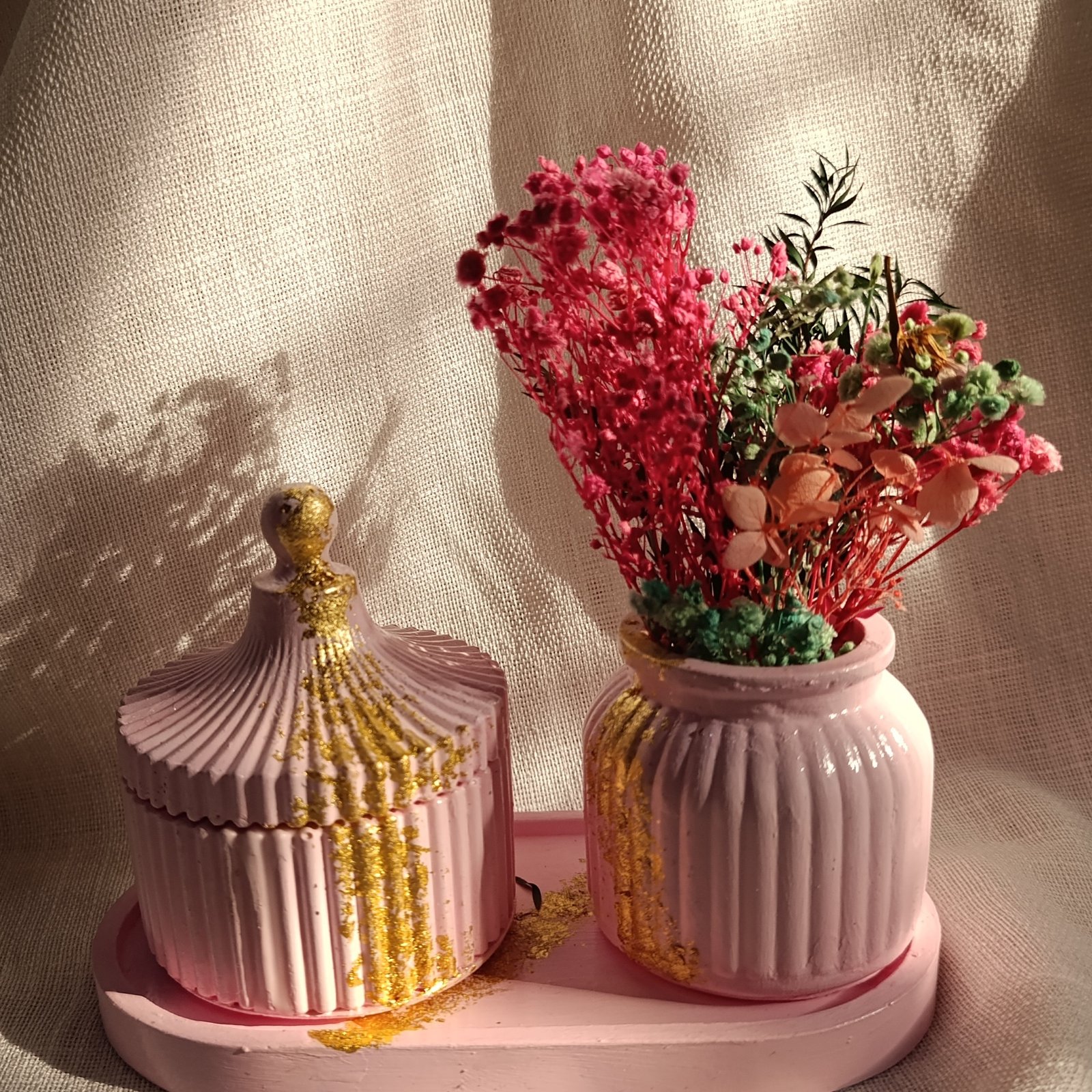 The Blush Bloom Duo Set by Lunis is a handcrafted concrete art piece designed to elevate any space with soft pink tones and delicate gold accents. This set includes a ribbed lidded container and a matching floral vase filled with vibrant dried flowers, making it perfect as a centerpiece, vanity décor, or shelf display. Its handcrafted texture, pastel aesthetics, and artistic detailing blend beautifully with modern, feminine, and minimal home styling themes. Ideal for gifting, home decoration, and aesthetic room setups.