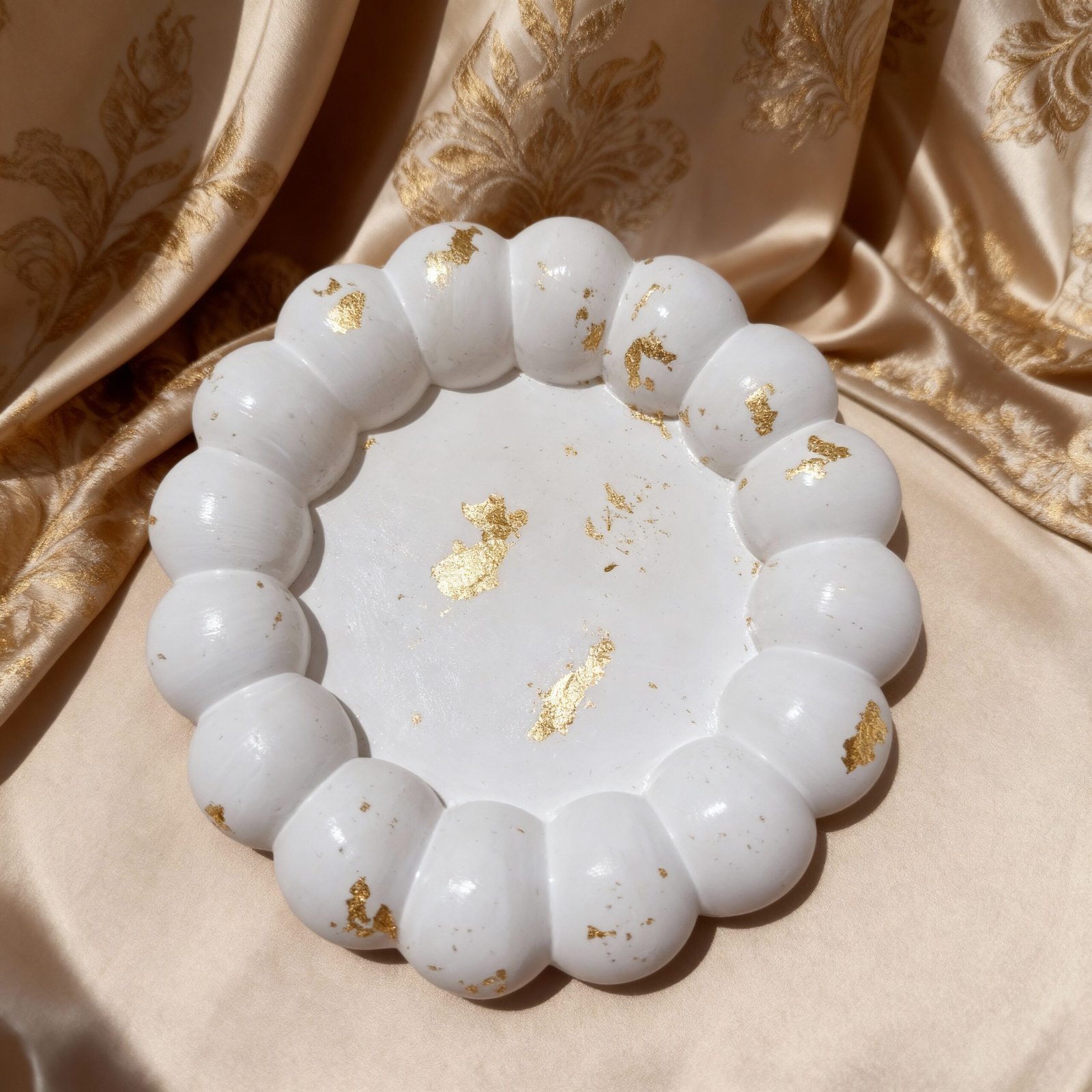 The Cloud Trinket Dish is a handcrafted concrete piece featuring a rounded, cloud-like border and delicate gold leaf details. Its smooth white finish gives it a clean, modern look, making it ideal for storing jewelry, keys, candles, or other small items. Durable, artistic, and versatile, it adds a soft decorative touch to vanities, nightstands, desks, or shelves. A lovely gift for anyone who appreciates simple yet stylish home décor.