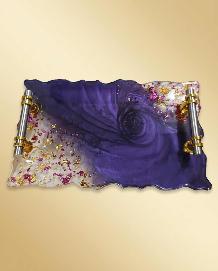 Elevate your home décor with this handcrafted luxury resin tray, featuring a mesmerizing purple galaxy swirl, crystal clear edges, and embedded gold & pink foil flakes. The elegant metallic handles add a premium finish, making it perfect as a serving tray, vanity tray, centerpiece, or gift item. Designed with high quality epoxy and vibrant pigments, this tray is a true statement piece for anyone who loves unique resin art, aesthetic décor, and handmade craftsmanship