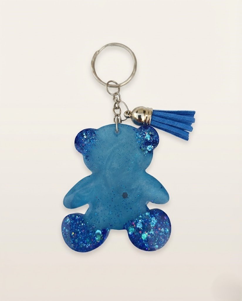 A charming, handmade epoxy resin keychain by Lunis resin art in the shape of a teddy bear. It features a stunning mix of fine blue glitter and large, chunky iridescent blue flakes concentrated in the ears and feet. Attached to a durable silver keyring with a matching blue faux suede tassel for an extra touch of flair. The perfect accessory for keys, bags, or backpacks.